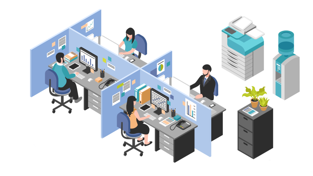 アメリカでは画像のように、パーテーションで区切られた半個室型のデスクが多く見られます。