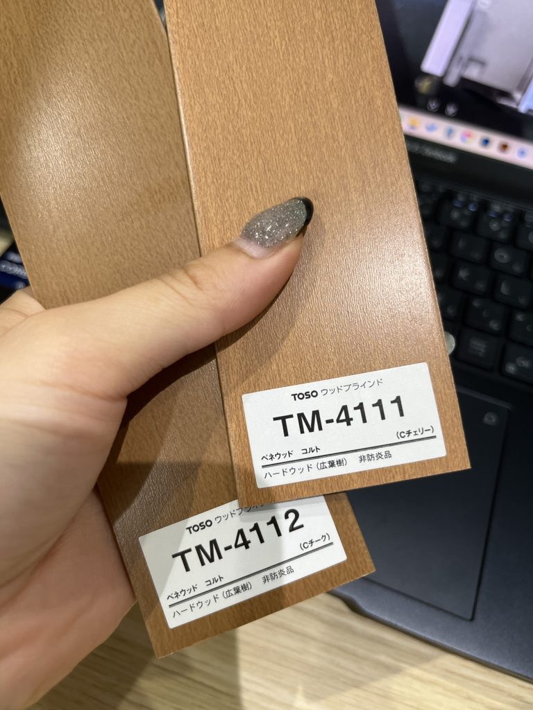 その他にも、チェアの張地やウッドブラインドの色味などもサンプルで、床や壁とのバランスを見ながら検討しています。