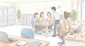 例えば、音への配慮でお悩み解消するため、「会話OKのエリア」と「静かに集中するエリア」を明確に分けるゾーニング。