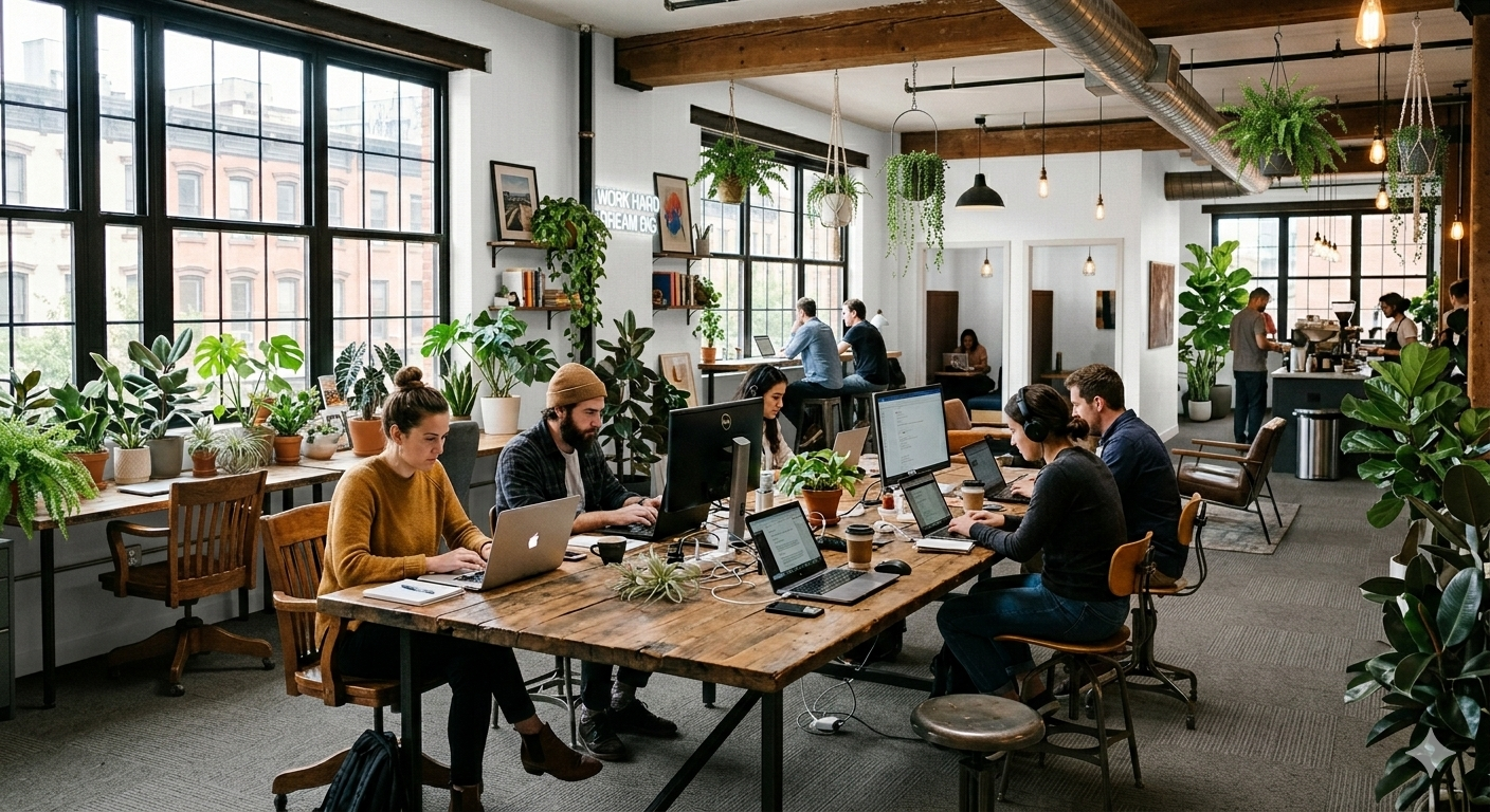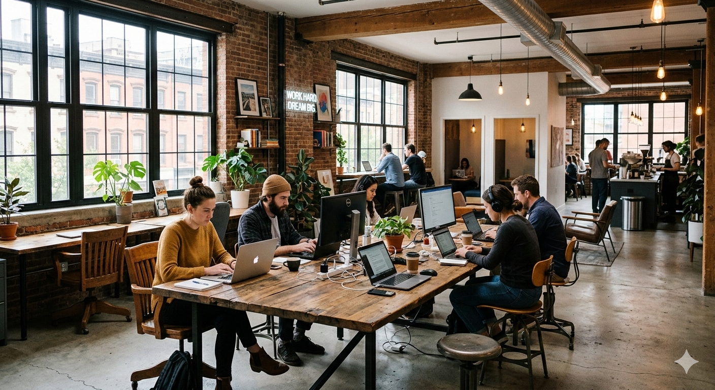 「ブルックリン風のフリーアドレスのオフィスデザインを考えて」というと次の画像が数秒で出来上がります。